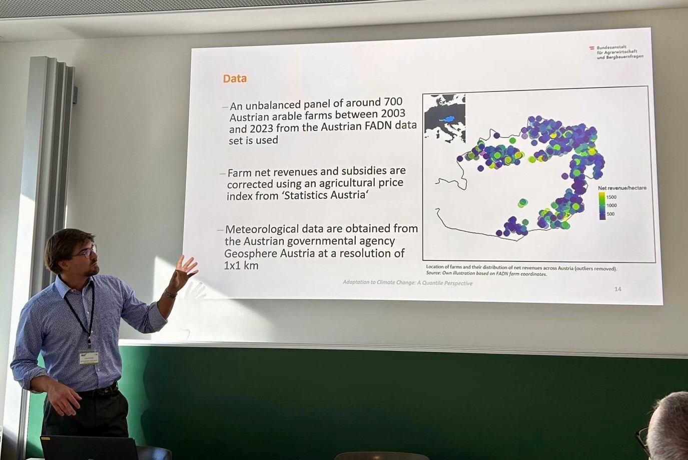 Als Teil der Session ‚Modellierung und Daten‘ stellte dieser Beitrag eine laufende Studie zum Zusammenhang zwischen Anpassungspotenzial und Anpassungsfähigkeit österreichischer Ackerbaubetriebe an den Klimawandel vor. Grundlage ist ein ökonometrisches Modell, das Daten einzelner Betriebe mit detaillierten meteorologischen Daten kombiniert. Erste Ergebnisse deuten darauf hin, dass Betriebe mit geringerer Anpassungsfähigkeit über ein begrenzteres Anpassungspotenzial verfügen. Dies unterstreicht die zentrale Rolle der Anpassungsfähigkeit und den Bedarf gezielter Politik zur Stärkung der Resilienz landwirtschaftlicher Betriebe. Dieser Beitrag ist Teil des Projektes „Klimawandelanpassung im österreichischen Ackerbau“. Für weitere Details, siehe https://dafne.at/projekte/klosta