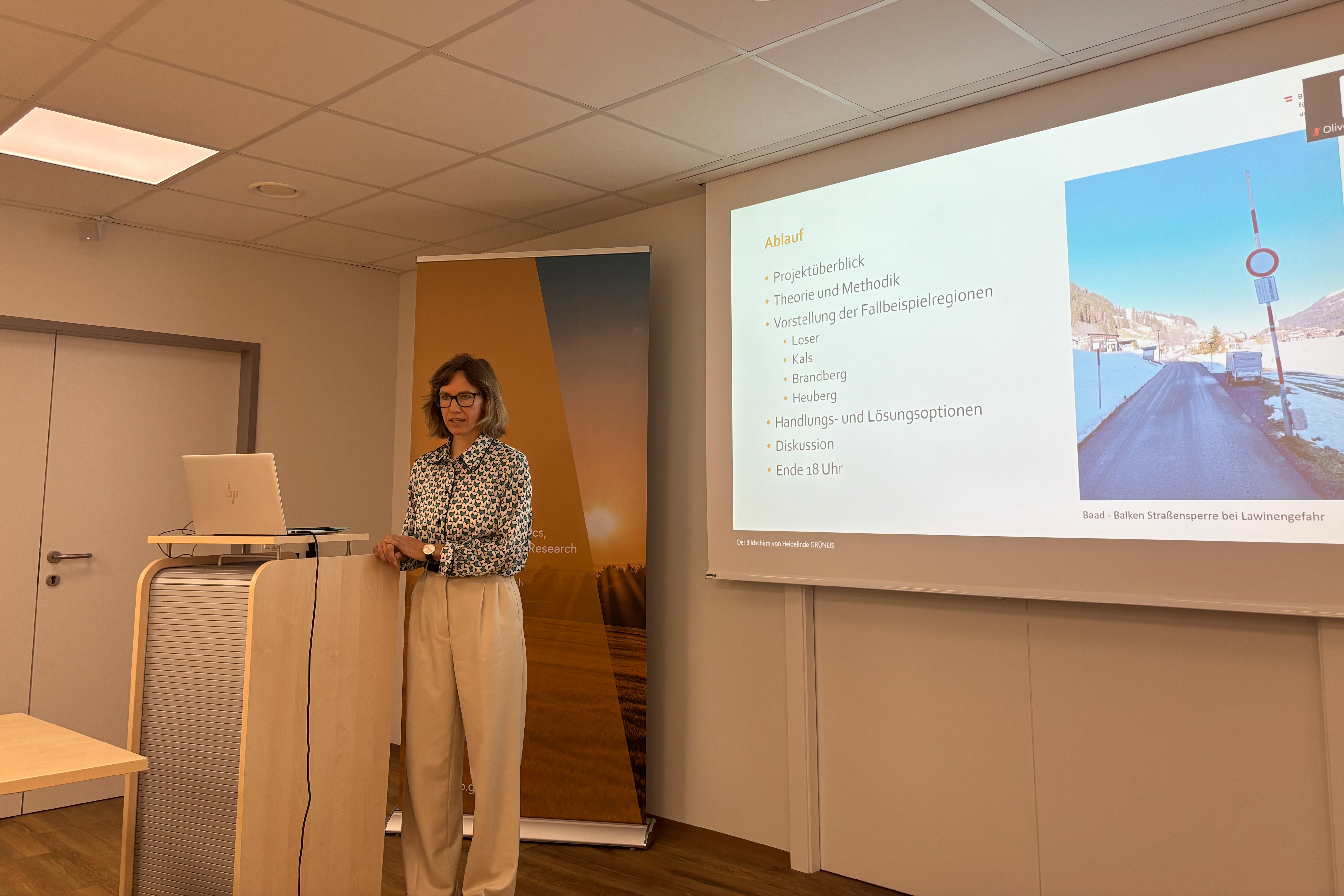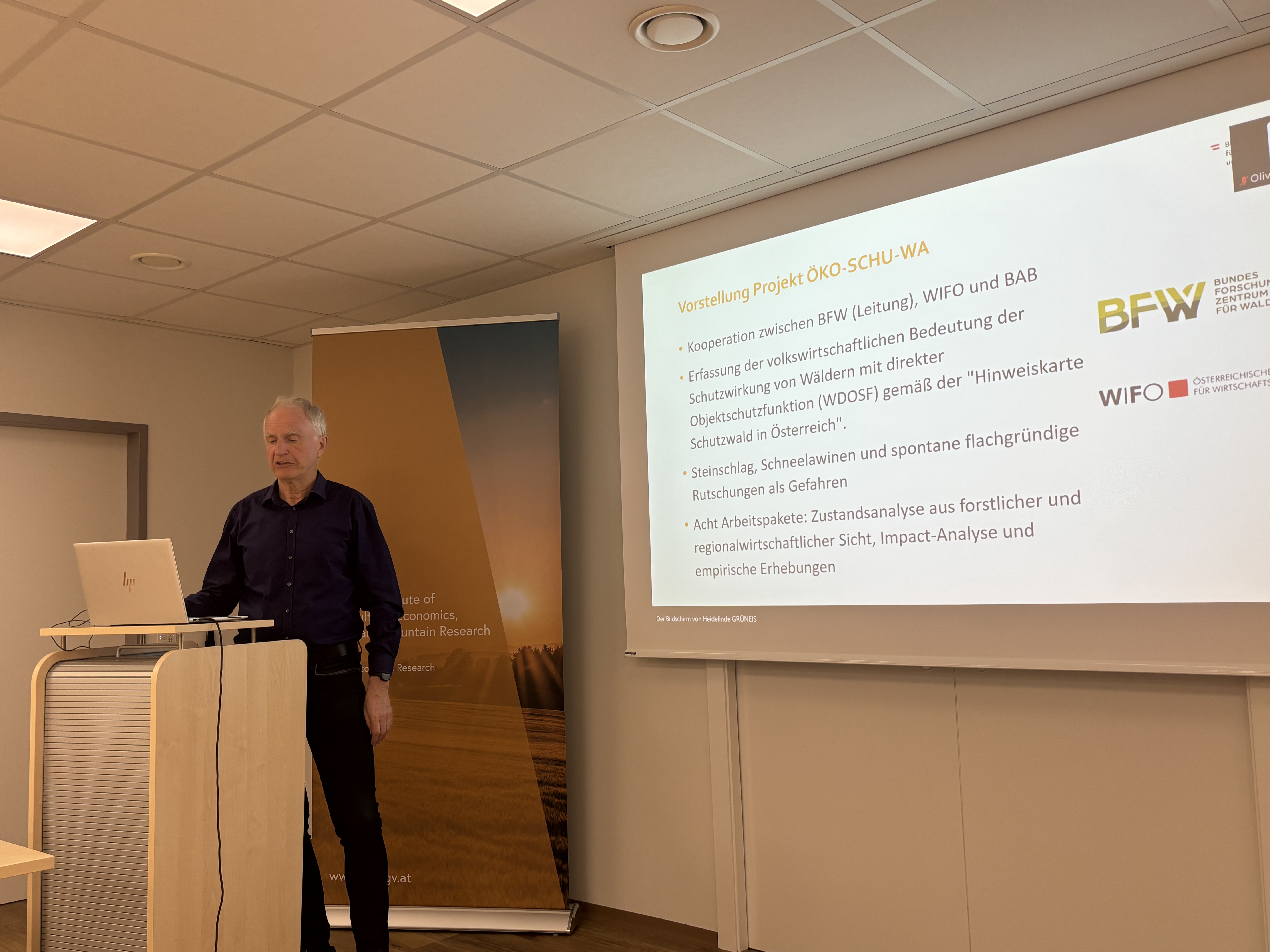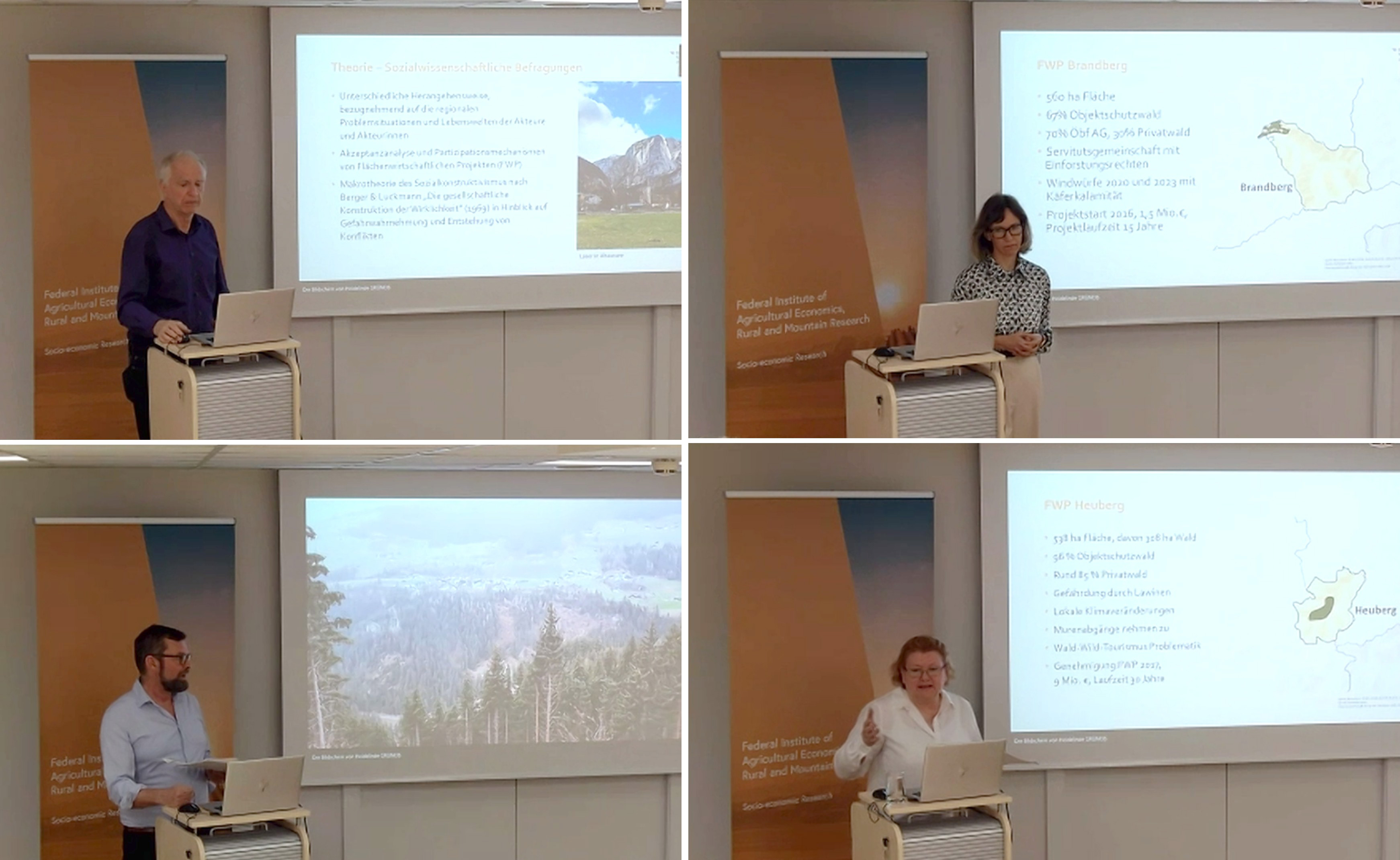 Das 10. BAB-Seminar fand am 4. März 2026 zum Thema „Die Bedeutung des Schutzwaldes aus Stakeholder-Perspektive in vier ausgewählten Regionen Österreichs“ statt. Es wurden die Ergebnisse der sozialwissenschaftlichen Befragungen, die im Rahmen des Projektes ÖKO-SCHU-WA (Die Bedeutung der Schutzwälder in Österreich und ihre regional- und volkswirtschaftliche Relevanz) durchgeführt wurden, präsentiert. Im Fokus von ÖKO-SCHU-WA stand die Funktion von Schutzwäldern als natürliche Barrieren gegen Naturgefahren wie Lawinen, Steinschlag und spontane flachgründige Rutschungen. Die Präsentationen von Georg Wiesinger, Heidelinde Grüneis, Oliver Tamme und Theresia Oedl-Wieser gaben Einblicke in die vier ausgewählten Fallbeispielregionen mit Flächenwirtschaftlichen Projekten – Loser (Steiermark), Heuberg (Vorarlberg), Kals (Osttirol) und Brandberg (Tirol). Diese Regionen zeichnen sich durch unterschiedliche Eigentumsstrukturen, Naturgefahren, forstliche Bedingungen und sozioökonomische Kontexte aus. Ziel war es, Maßnahmen zum Erhalt und zur Verbesserung der Schutzwirkung der Wälder zu erheben und des Weiteren zu analysieren, wie gesellschaftliche, ökologische und institutionelle Faktoren in den einzelnen Fallbeispielregionen zusammenwirken. Hierbei wurden Unterschiede und Gemeinsamkeiten bei Risikowahrnehmung, Problembewusstsein und Partizipation analysiert und der Umgang mit Naturgefahren und Klimawandelfolgen in den Fallbeispielregionen aufgezeigt.